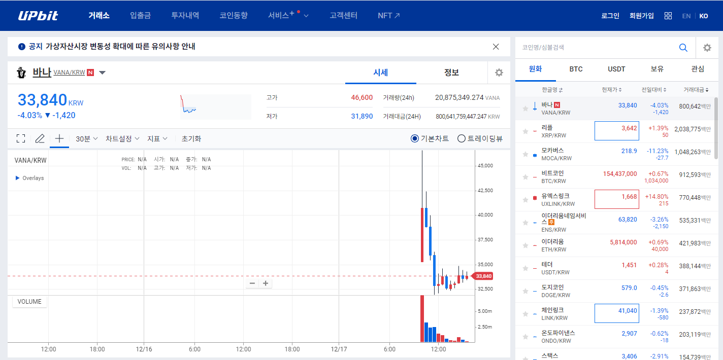 바나코인의 시세 급등 원인으로는 업비트 상장이라는 큰 이벤트가 주요 요인으로 작용했습니다.