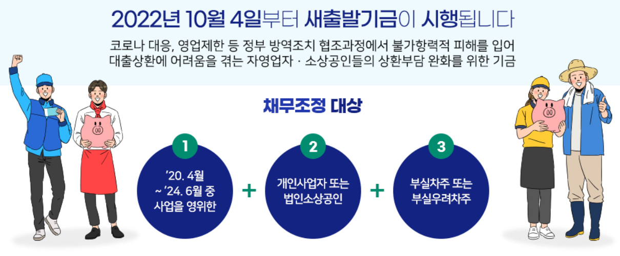 새출발기금은 부채 상환에 어려움을 겪고 있는 개인과 소상공인들에게 재기의 기회를 제공하기 위해 마련된 정부 지원 프로그램입니다. 경제적 어려움에 처한 사람들이 새로운 출발을 할 수 있도록 다양한 금융 지원과 부채 조정 서비스를 제공합니다.