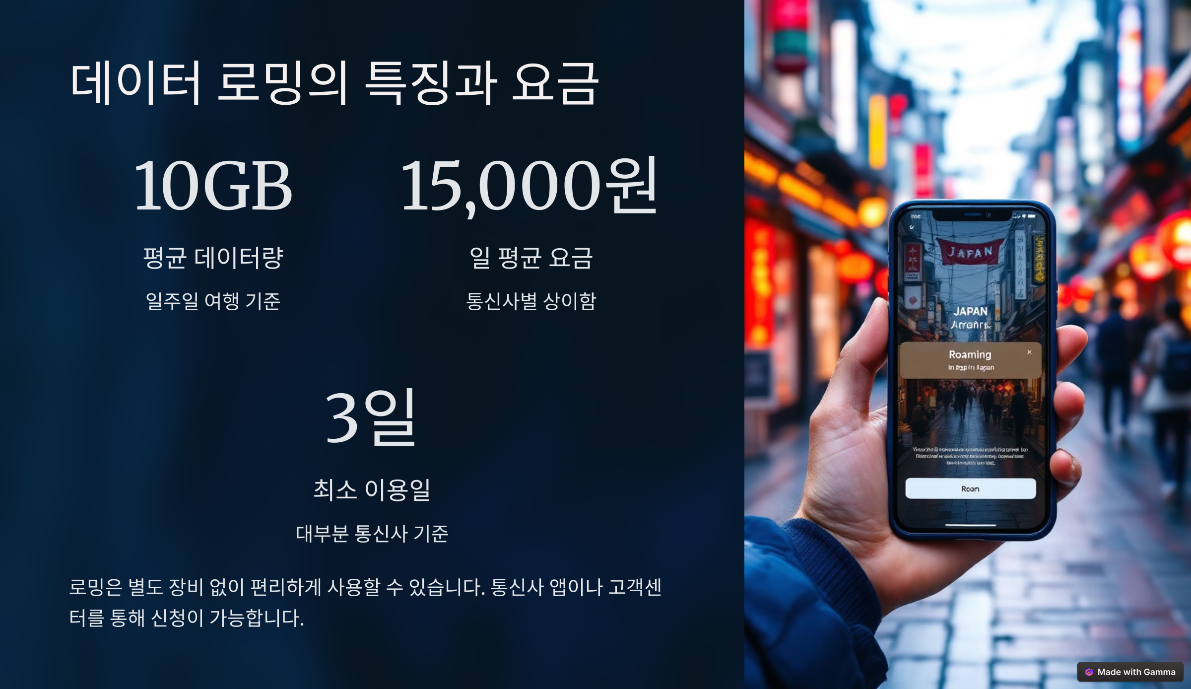 데이터 로밍은 국내 통신사를 그대로 이용해서 해외에서 데이터를 사용하는 방식이에요. 특별히 설정할 것 없이, 비행기에서 내리면 자동으로 일본 통신사와 연결돼요. 간편함은 최고예요. 😊