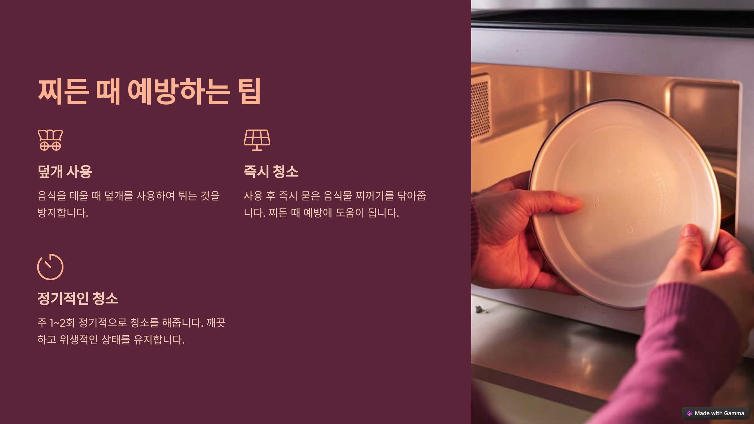 깨끗한 전자레인지는 화재나 전기적인 문제를 예방하는 데 도움이 됩니다.
