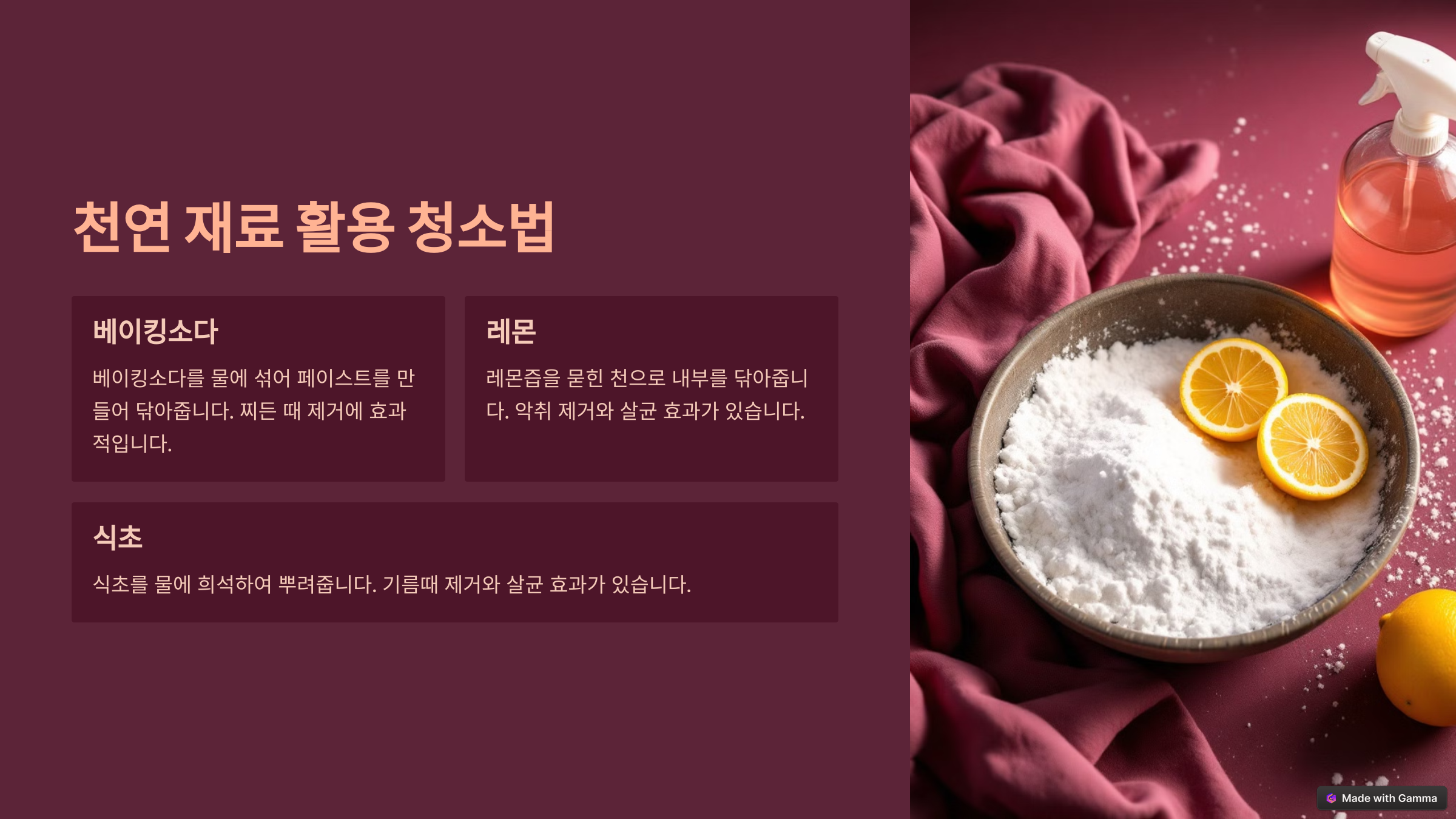 베이킹소다, 식초, 레몬 등 천연 청소 재료는 안전하고 효과적입니다.