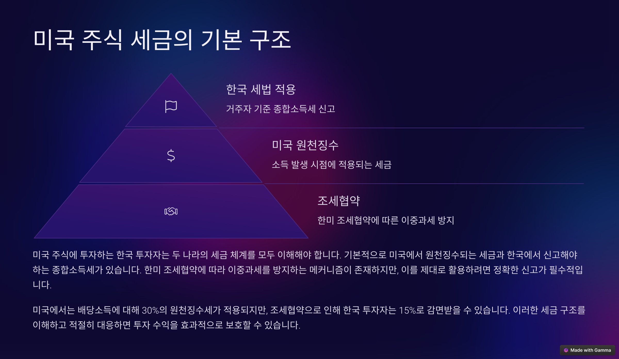 미국 배당소득의 경우 일반적으로 15% 세금이 미국 정부에 의해 자동으로 원천징수돼요. 그런데 한국에도 배당소득세 신고 대상이 되기 때문에, 이중과세 우려가 생길 수 있어요. 이걸 방지하기 위한 세액공제 제도가 있으니 꼭 기억해두세요!