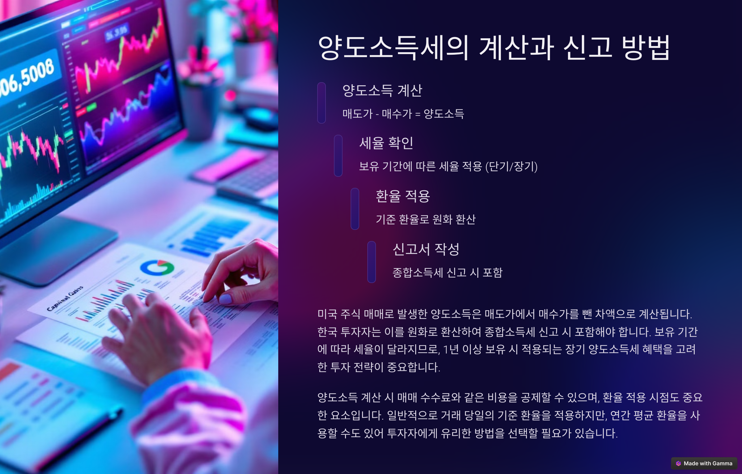 미국 주식 거래는 대부분 달러로 이뤄지기 때문에, 환산 환율을 적용해야 해요. 이는 '매도일 전월의 평균 환율'을 사용해 원화로 환산하게 돼요. 예를 들어 3월에 팔았다면 2월 평균 환율을 참고해야 해요.